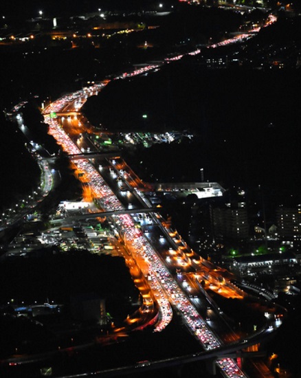 5月5日19时22分,出现严重拥堵的名神高速公路。(图片来源:《朝日新闻》)