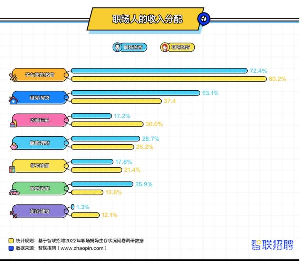 在收入分配上,80.2%的职场妈妈将收入主要用于子女抚养和教育。此外,21.4%的职场妈妈将收入用来学习培训,高于已婚未育女性(19.9%)和职场爸爸(17.8%),未放弃充电和奋斗,保持乐观向上的心态。