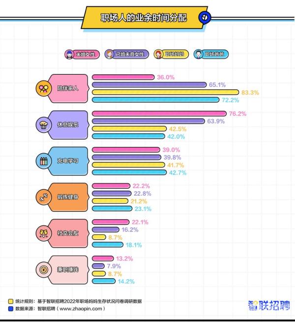 在照顾家庭之余,她们也不忘娱乐和学习,选择用业余时间休息娱乐和充电学习的职场妈妈,分别占比42.5%、41.7%。具体到家务方面,61.3%的职场妈妈每天在家务中投入1小时以上,占比高于职场爸爸的56.7%。