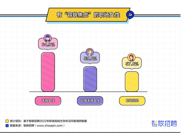 数据表明,有容貌焦虑的职场妈妈整体占比57.8%,低于未婚女性(64.9%)和已婚未育女性(59.8%),这与2021年的情况大体相当。