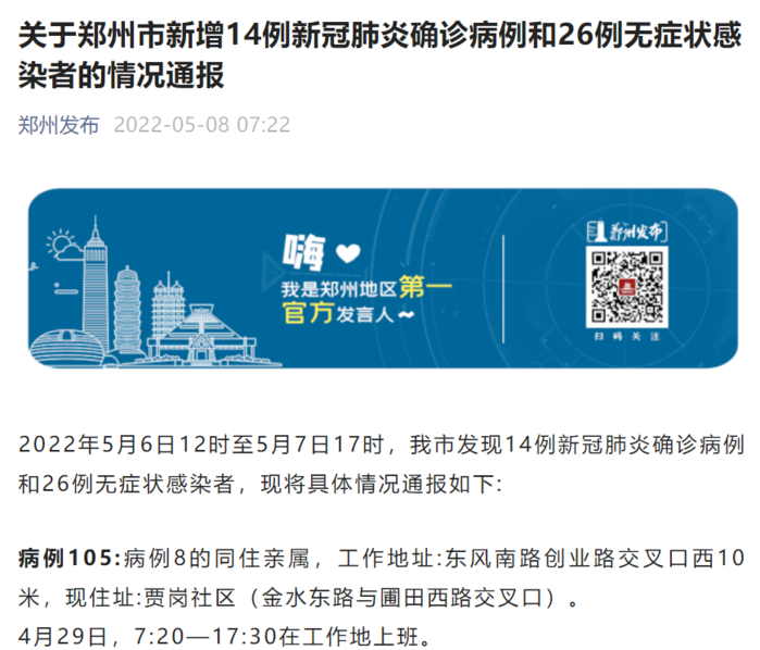 荔枝新闻讯 据“郑州发布”微信号消息,2022年5月6日12时至5月7日17时,我市发现14例新冠肺炎确诊病例和26例无症状感染者,现将具体情况通报如下: