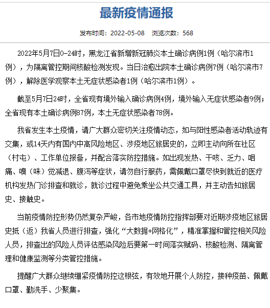 荔枝新闻讯 2022年5月7日0-24时,黑龙江省新增新冠肺炎本土确诊病例1例(哈尔滨市1例),为隔离管控期间核酸检测发现。当日治愈出院本土确诊病例7例(哈尔滨市7例),解除医学观察本土无症状感染者1例(哈尔滨市1例)。