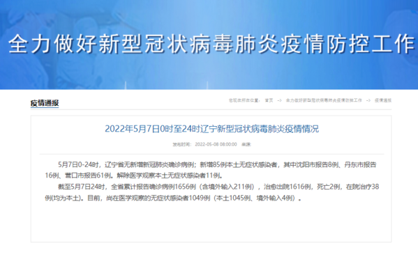 荔枝新闻讯 据辽宁卫健委网站消息,5月7日0—24时,辽宁省无新增新冠肺炎确诊病例;新增85例本土无症状感染者,其中沈阳市报告8例、丹东市报告16例、营口市报告61例。解除医学观察本土无症状感染者11例。