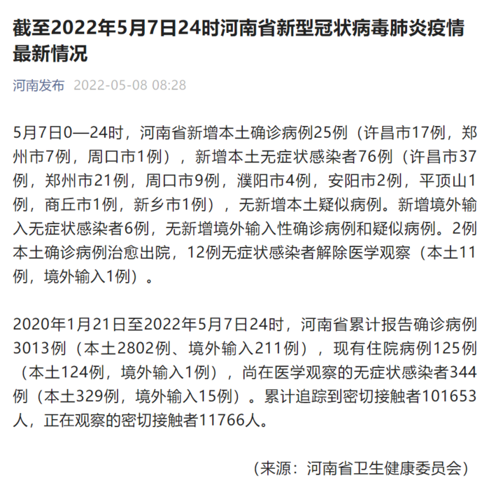 2020年1月21日至2022年5月7日24时,河南省累计报告确诊病例3013例(本土2802例、境外输入211例),现有住院病例125例(本土124例,境外输入1例),尚在医学观察的无症状感染者344例(本土329例,境外输入15例)。累计追踪到密切接触者101653人,正在观察的密切接触者11766人。