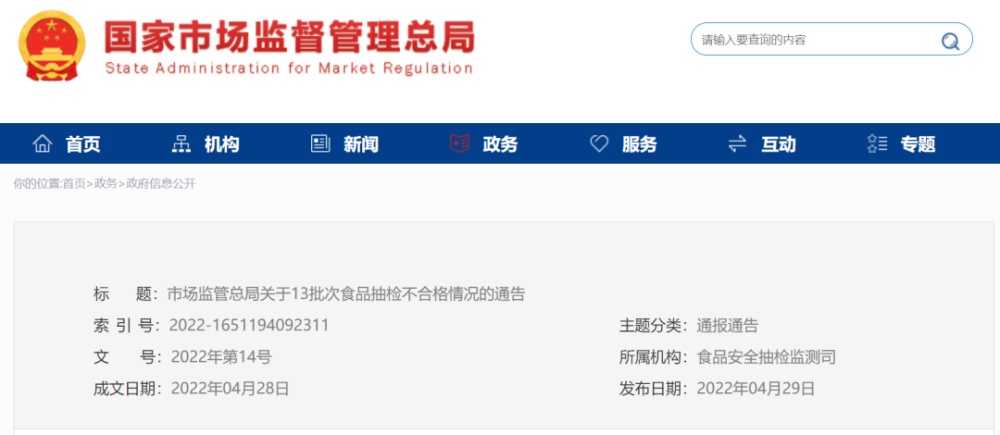 最近,国家市场监管总局通报了13批次食品抽检不合格。