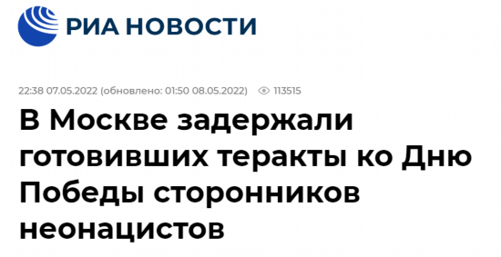 俄新社:新纳粹分子支持者在莫斯科被抓获,其准备在胜利日到来之际发动恐袭