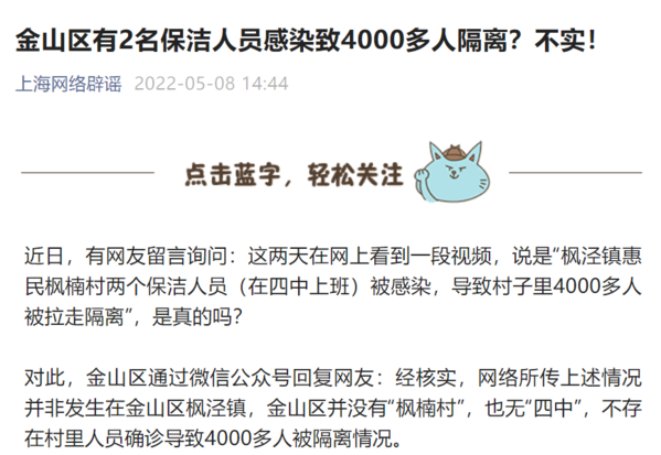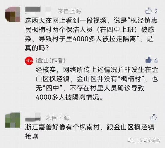 对此,金山区通过微信公众号回复网友:经核实,网络所传上述情况并非发生在金山区枫泾镇,金山区并没有“枫楠村”,也无“四中”,不存在村里人员确诊导致4000多人被隔离情况。