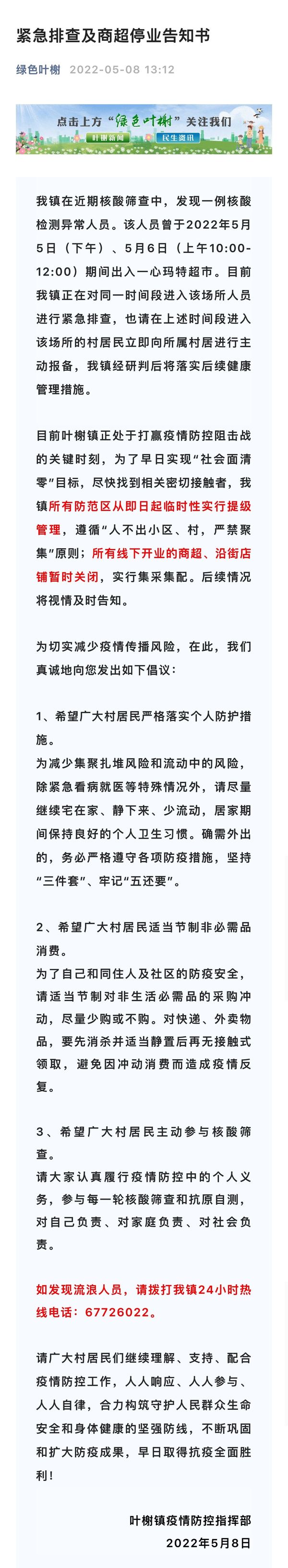 目前叶榭镇正处于打赢疫情防控阻击战的关键时刻,为了早日实现“社会面清零”目标,尽快找到相关密切接触者,我镇所有防范区从即日起临时性实行提级管理,遵循“人不出小区、村,严禁聚集”原则;所有线下开业的商超、沿街店铺暂时关闭,实行集采集配。后续情况将视情及时告知。