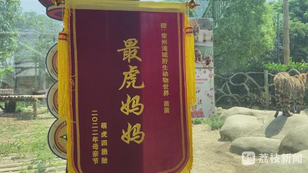 四只小东北虎威风凛凛抵达东北虎馆,虎妈看到四只小老虎出现,伸出虎爪拍打玻璃,“萌虎”和虎妈母亲节同框,画面温馨。“平安喜乐”为虎妈送上母亲节礼物,除了全家福、肉与温馨的亲笔信外,一面印着“最虎妈妈”的锦旗引起大家的关注。饲养员告诉记者,这只虎妈妈名叫“苗苗”,今年7岁,正处于壮年时期,也是常州淹城野生动物世界东北虎中孕育最多的虎妈妈,2021年至今,“苗苗”更是率先完成三胎政策,两年内成功孕育5次,共生育16只虎宝宝,最“虎”妈妈称号实至名归!