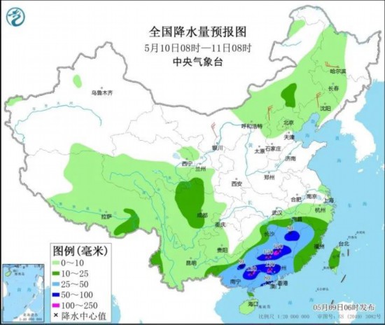 据中央气象台预报,5月9日至13日,江南、华南及贵州、云南等地有大到暴雨,江南南部、华南等地的部分地区有大暴雨,预计大部累计降水量50至70毫米,江南南部至华南大部100至200毫米,广西中北部、广东中北部和沿海地区局地超过300毫米。经综合研判和应急会商,中国气象局于5月9日8时30分启动三级应急响应。