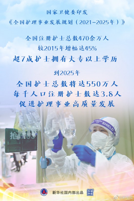 记者9日从国家卫健委获悉,国家卫健委近日印发《全国护理事业发展规划(2021-2025年)》。规划指出,2020年底,全国注册护士总数470余万人,较2015年增幅达45%。具有大专以上学历的护士超70%,护士队伍学历素质进一步提高。护理工作是卫生健康事业的重要组成部分,对全面推进健康中国建设、积极应对人口老龄化具有重要意义。规划要求,到2025年,全国护士总数达到550万人,每千人口注册护士数达到3.8人,护士队伍数量持续增加,结构进一步优化,素质和服务能力显著提升,促进护理事业高质量发展。(记者李恒、徐鹏航,海报设计乔昕)