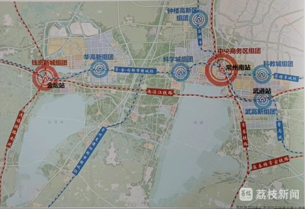 常州南站作为常州“两湖”创新区的“核中核”、“极中极”,将打造长三角中轴枢纽的“第一门户”和城市“中央车站”。常州市自然资源和规划局总规划师孙秀峰在发布会上表示,常州南站枢纽综合体初步规划了“1+4+4”的轨道交通构成,即1条高速铁路常泰铁路,4条都市快线分别往苏州无锡、奔牛机场、金坛溧阳、太湖湾方向,同时预留3条垂直和1条平行引入地铁线的条件,将形成多网融合的轨道线路。同时,常州南站将打造集商业、文化、娱乐等城市功能为一体的站城枢纽综合体,预计总建筑面积约为100万平方米,是两湖创新区核心区重要的核心功能板块。常州南站将以“新淹城”为总体设计理念,营造独特的地标建筑群组,形成疏密有致、高低错落的街道界面,塑造兼具国际品质与地域特色的城市门户形象,雕琢一系列特色场景,创造有独特性、有识别度、有吸引力的城市客厅图景。