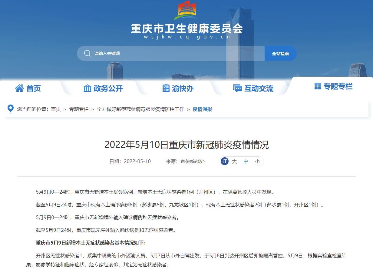 截至5月9日24时,重庆市现有本土确诊病例6例(彭水县5例、九龙坡区1例),现有本土无症状感染者2例(彭水县1例、开州区1例)。