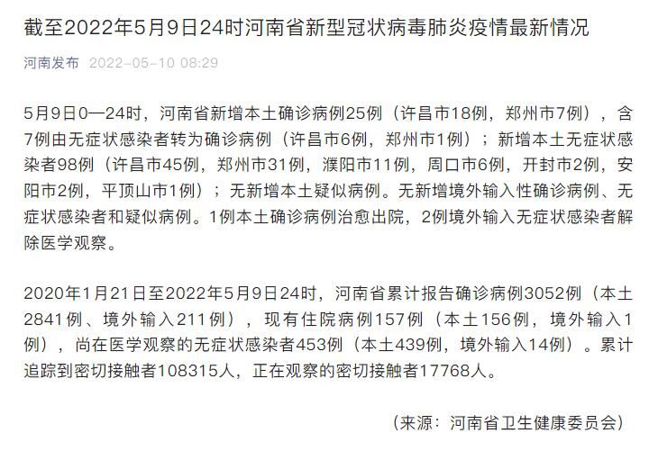 2020年1月21日至2022年5月9日24时,河南省累计报告确诊病例3052例(本土2841例、境外输入211例),现有住院病例157例(本土156例,境外输入1例),尚在医学观察的无症状感染者453例(本土439例,境外输入14例)。累计追踪到密切接触者108315人,正在观察的密切接触者17768人。