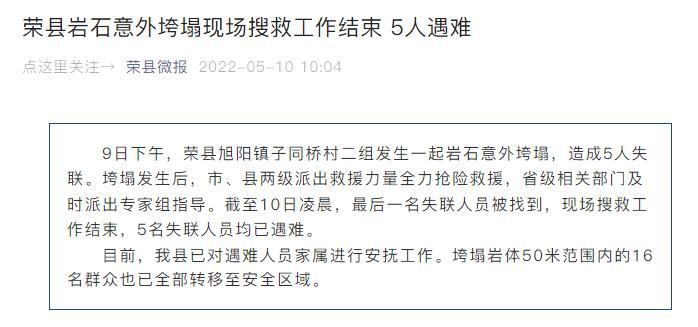 荔枝新闻讯 据“荣县微报”微信公众号消息,9日下午,荣县旭阳镇子同桥村二组发生一起岩石意外垮塌,造成5人失联。垮塌发生后,市、县两级派出救援力量全力抢险救援,省级相关部门及时派出专家组指导。截至10日凌晨,最后一名失联人员被找到,现场搜救工作结束,5名失联人员均已遇难。