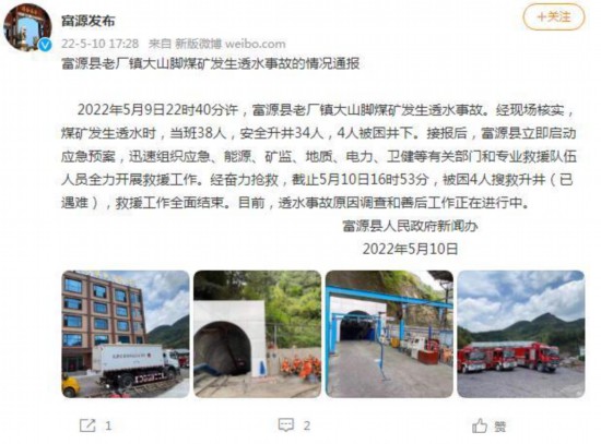 荔枝新闻讯 据“富源发布”微博号消息,2022年5月9日22时40分许,富源县老厂镇大山脚煤矿发生透水事故。经现场核实,煤矿发生透水时,当班38人,安全升井34人,4人被困井下。接报后,富源县立即启动应急预案,迅速组织应急、能源、矿监、地质、电力、卫健等有关部门和专业救援队伍人员全力开展救援工作。经奋力抢救,截止5月10日16时53分,被困4人搜救升井(已遇难),救援工作全面结束。目前,透水事故原因调查和善后工作正在进行中。