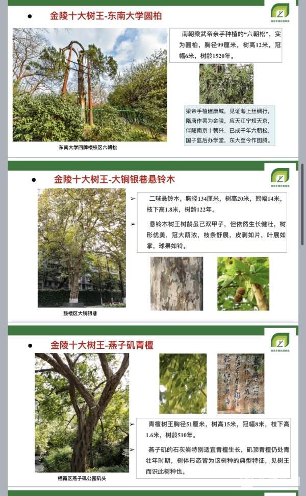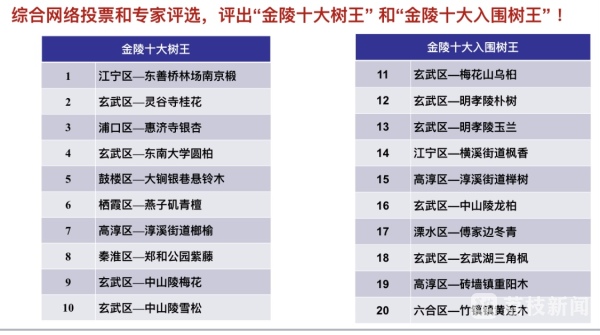本次活动兼顾专业性和科普性,按照40%网民投票+60%专家评分的原则,综合评选出“金陵十大树王”,分别是: