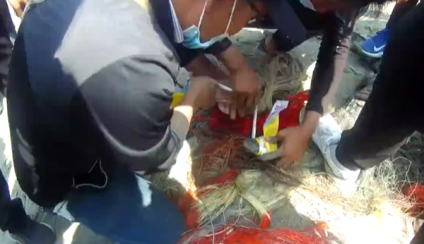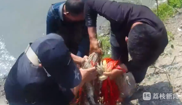 在河道对岸一侧,果然隐约可见一条鳄鱼,样子凶猛,极具攻击性。工作人员经紧急商量,决定使用网具抓捕鳄鱼。随后,工作人员驾驶小船,缓缓靠近鳄鱼,向其抛撒渔网。待将鳄鱼网住后,随即转移到河岸上。众人因陋就简,使用警戒绳,将鳄鱼的嘴巴、四肢固定住,使其失去攻击性。