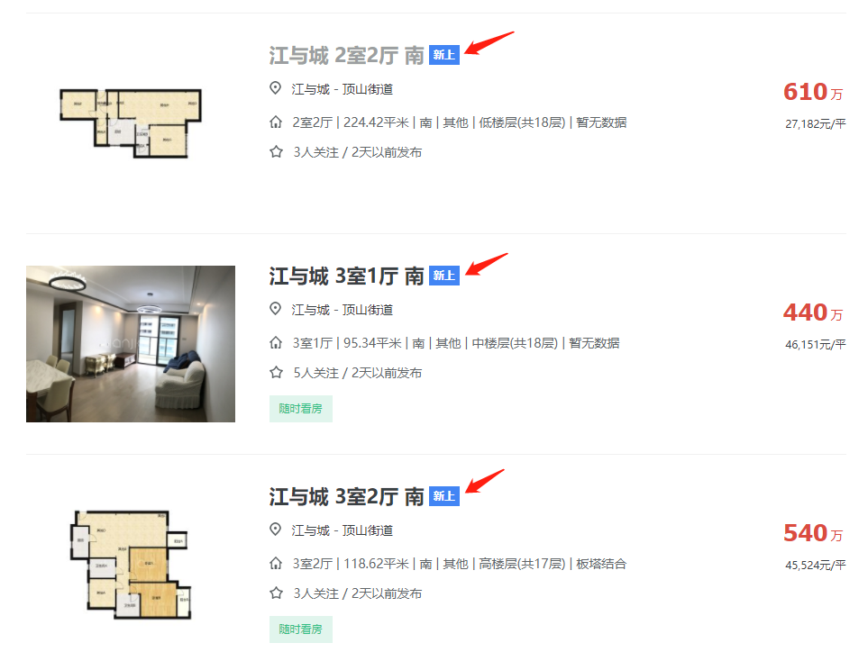 在挂牌价上,记者看到江北部分小区的报价基本与市场行情等同,如江与城的报价在41000元-45000元/㎡之间,扬子江金茂悦和绿地海悦的报价在45000元-50000元/㎡左右。不过也有涨价的楼盘,位于江北核心区的某楼盘89平方米户型报价51200元/㎡,比之前报价小涨200元/㎡,降价的项目也有不少,单价最低的一套均价为“3”字头,且贴上了“急售”的标签。