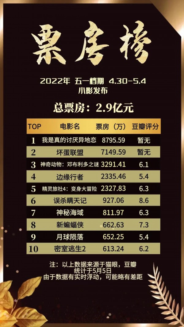 而好莱坞动画电影《坏蛋联盟》票房位列第二,可见合家欢是小长假亲子家庭的刚需。《神奇动物:邓布利多之谜》继续稳定发挥,票房位列第三名。