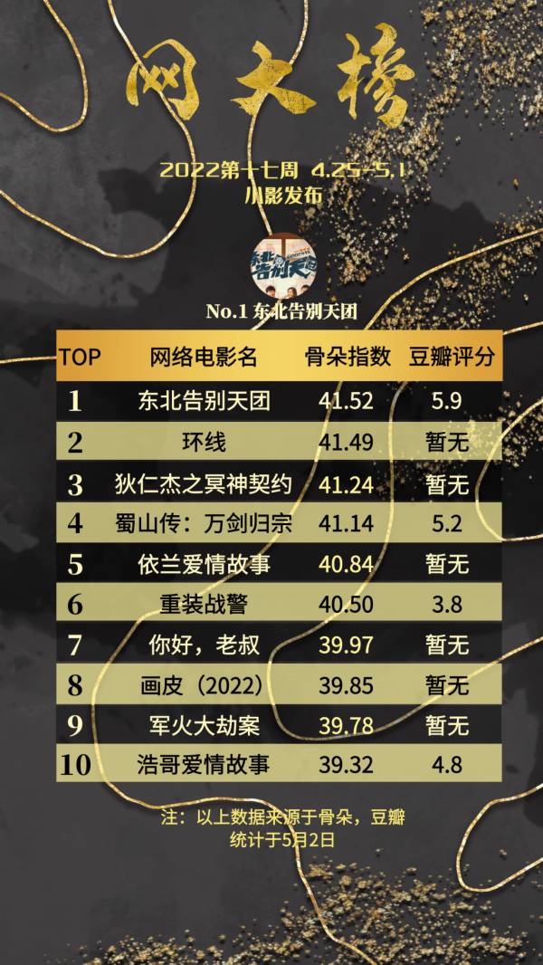 相对院线电影受制于线下活动条件,网络电影更加活跃,题材多元,各具亮点。领跑榜单的是腾讯出品的喜剧电影《东北告别天团》,影片上线首日分账票房278万,上线一周累计票房超1300万。