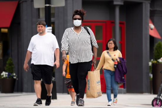 5月11日,在美国首都华盛顿,一名行人提着购物袋走过街头。新华社记者刘杰摄