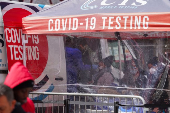 3月29日,医护人员在美国纽约时报广场一个新冠病毒检测点取样。新华社记者王迎摄