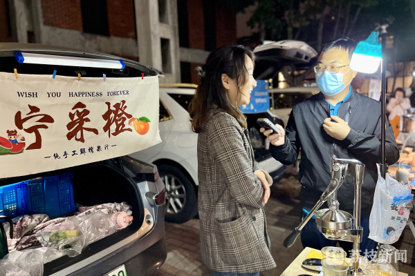 前来摆摊的车主背景迥异,有开实体餐饮店的小老板,也有金融、文化等行业从业者第一次出摊卖货。手作鲜果茶“宁采橙”的摊主梁女士是一名资深HR,虽然尝试做后备箱集市只有四五天,但她已经积累了一些生意经。在她看来,要想在五彩斑斓的后备箱集市吸引到顾客,“招牌”不能落了下风:“我家是做橙子果茶的,想让大家记得住,我们运用了谐音梗,招牌‘宁采橙’寓意‘在南京采的橙汁’。”