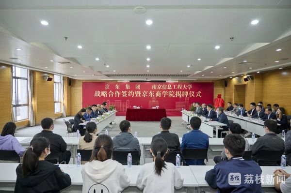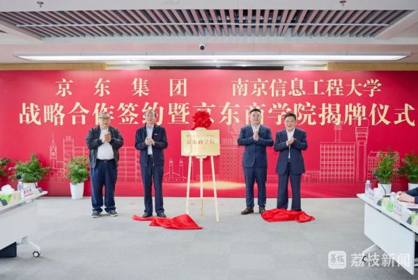 会上,双方签署战略合作协议,并为南信大京东商学院揭牌。根据协议,校企将合作共建“京东商学院”,创设“京东实验班”“京东商务班”“京东产教融合协同育人基地”等;共建“京东信大智能物流研究院”,加速推动基础研究成果在商业领域的应用转化与推广;共建“京东校园馆”,建成在校师生实习实训和创新创业的重要基地。