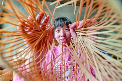贵州省三穗县八弓镇界牌村,返乡青年杨杜娟在制作竹编产品。新华社发