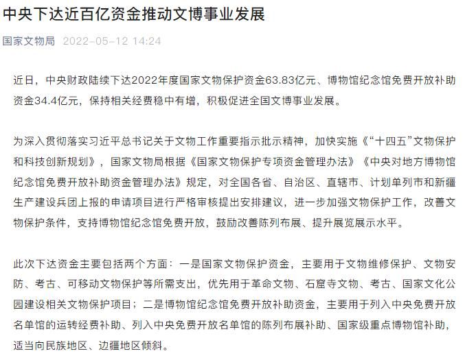 荔枝新闻讯 据国家文物局微信公号消息,近日,中央财政陆续下达2022年度国家文物保护资金63.83亿元、博物馆纪念馆免费开放补助资金34.4亿元,保持相关经费稳中有增,积极促进全国文博事业发展。
