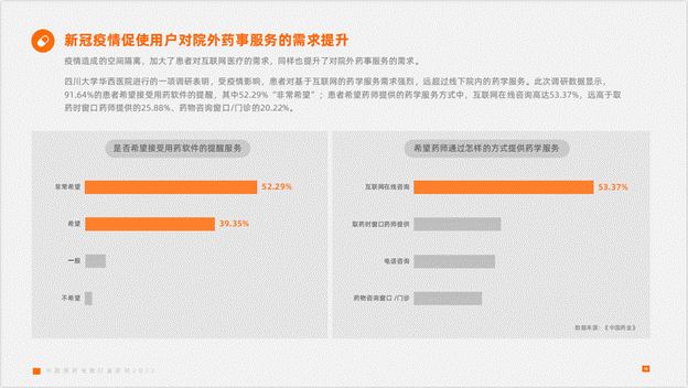 据动脉网《中国医药电商行业研究2022》援引一份来自四川大学华西医院的调研表明,受疫情影响,患者对基于互联网的药学服务需求强烈,远超过线下院内的药学服务;其中91.6%的患者希望接受用药软件的提醒,而在患者希望药师提供的药学服务方式中,互联网在线咨询高达53.4%,远高于取药时窗口药师提供的25.9%。