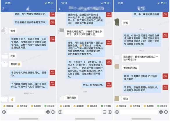 以糖尿病关爱中心为例,由于糖尿病发病原因复杂,药品品类多,不同的患者之间的用药方案差距大,不只用药类型差别明显,而且同种药品在用法用量上也有很多不同。在这样的情况下,保证患者知晓正确用药就显得尤为重要。基于此,京东大药房糖尿病关爱中心采取了强随访的管理模式,在患者购药后,京东健康会安排医生进行回访,并通过对患者的BMI、血糖、用药方案的掌握,及时提醒患者服药、帮助患者稳定血糖及做好健康管理。在这一过程中,执业药师也会对对用药数据进行多维度的分析,以制定更合理的用药方案,更好的保障患者的健康。