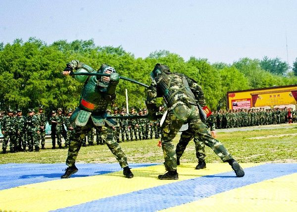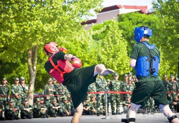 在擒敌比赛考核现场,拳手击打发出的“啪啪”声和场下观众的呐喊声混成一片,身着红、蓝护具的两名选手互不相让。