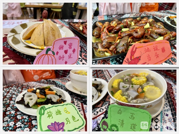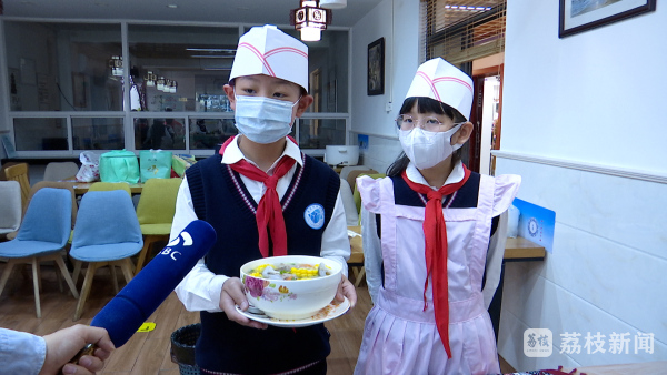 “我们学校是荷文化,这碗玉米排骨莲子汤里的莲子,就像是我们小莲宝;而汤洁白如玉,寓意我们莲宝要像这道菜一样清清白白。”五年级学生徐振曦介绍。