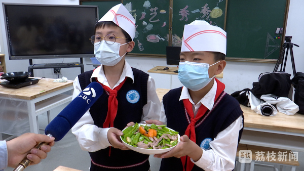 五年级学生任楷麒和李正阳共同完成了“合荷小炒“这道菜。任楷麒说:“合是合作的意思,荷是指做菜用的荷兰豆。”