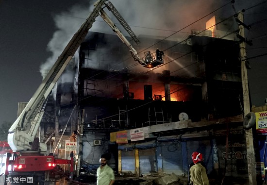 印度首都新德里西部Mundka地铁站附近的一栋4层商业楼发生火灾,图自视觉中国