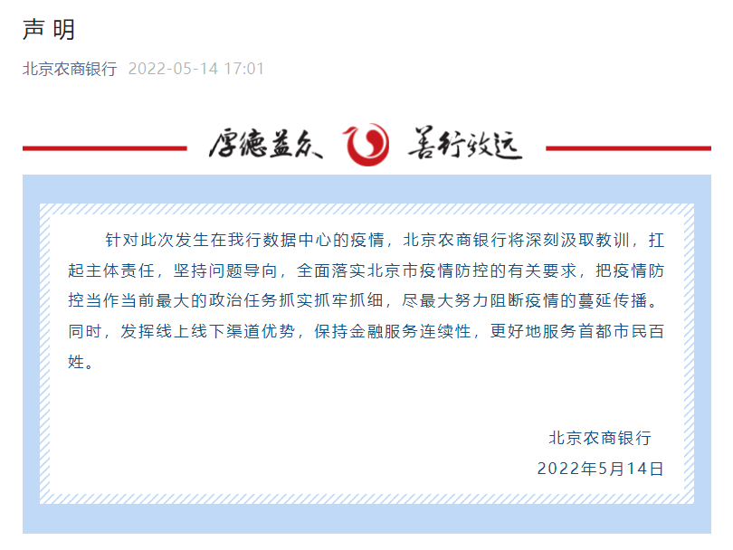 荔枝新闻讯 5月14日,“北京农商银行”微信公众号发布声明,针对北京农商银行空港办公区发生聚集性疫情深刻汲取教训,尽最大努力阻断疫情的蔓延传播。声明全文如下: