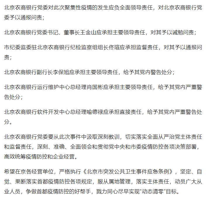 北京农商银行党委对此次聚集性疫情的发生应负全面领导责任,对北京农商银行党委予以通报问责;