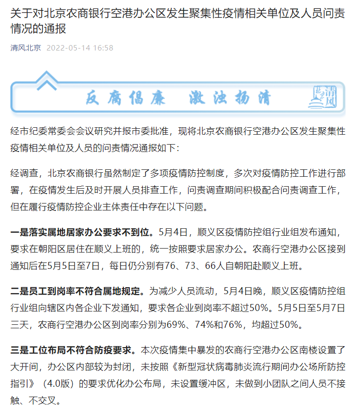荔枝新闻讯 5月14日,“清风北京”微信公众号发布关于对北京农商银行空港办公区发生聚集性疫情相关单位及人员问责情况的通报。通报全文如下: