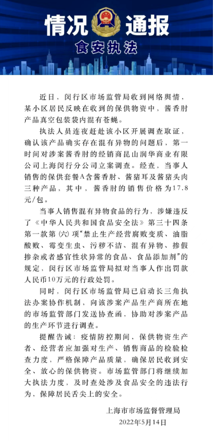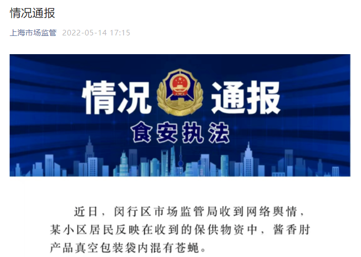 荔枝新闻讯 “上海市场监管”微信公众号5月14日消息,近日,上海市闵行区市场监管局收到网络舆情,某小区居民反映在收到的保供物资中,酱香肘产品真空包装袋内混有苍蝇。