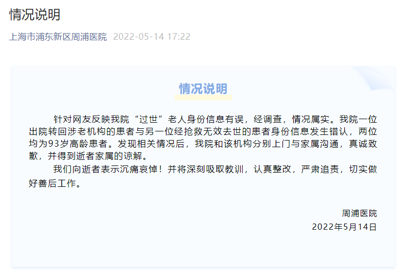 上海市浦东新区周浦医院称:“我院一位出院转回涉老机构的患者与另一位经抢救无效去世的患者身份信息发生错认,两位均为93岁高龄患者。发现相关情况后,我院和该机构分别上门与家属沟通,真诚致歉,并得到逝者家属的谅解。我们向逝者表示沉痛哀悼!”