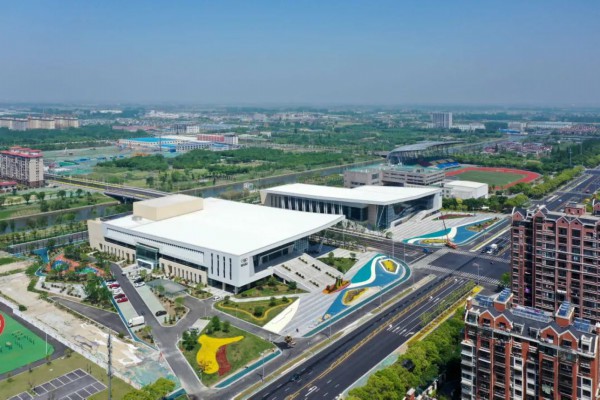 从空中俯瞰,姜堰体育馆恍若一艘在水中飞篙走桨的会船,蔚为壮观。