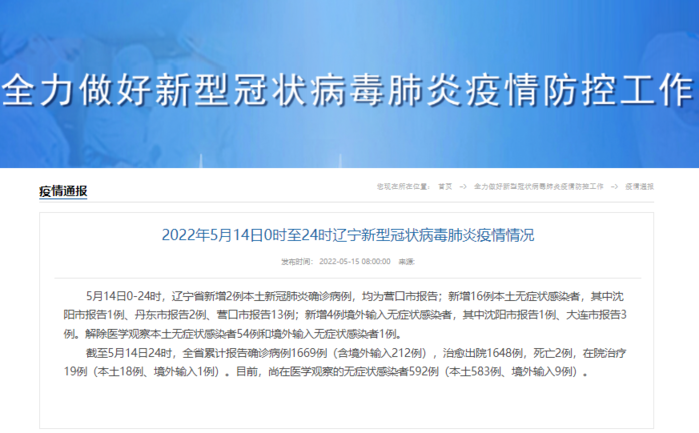 荔枝新闻讯 据辽宁卫健委网站消息,5月14日0-24时,辽宁省新增2例本土新冠肺炎确诊病例,均为营口市报告;新增16例本土无症状感染者,其中沈阳市报告1例、丹东市报告2例、营口市报告13例;新增4例境外输入无症状感染者,其中沈阳市报告1例、大连市报告3例。解除医学观察本土无症状感染者54例和境外输入无症状感染者1例。