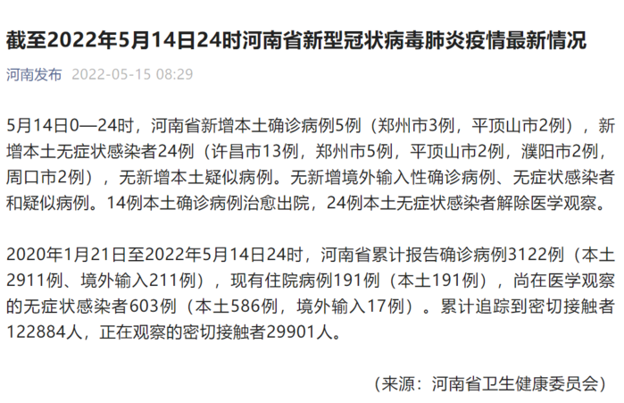2020年1月21日至2022年5月14日24时,河南省累计报告确诊病例3122例(本土2911例、境外输入211例),现有住院病例191例(本土191例),尚在医学观察的无症状感染者603例(本土586例,境外输入17例)。累计追踪到密切接触者122884人,正在观察的密切接触者29901人。