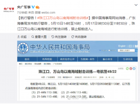 据中国海事局网站消息,广东海事局发布航行警告,5月15日14时至16时 ,5月17日9时30分至11时30分 ,珠江口万山岛以南海域进行射击训练,禁止船舶进入。