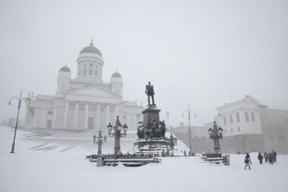2021年3月9日,行人冒雪在芬兰首都赫尔辛基大教堂前行走。新华社发(马蒂·马蒂凯宁摄)