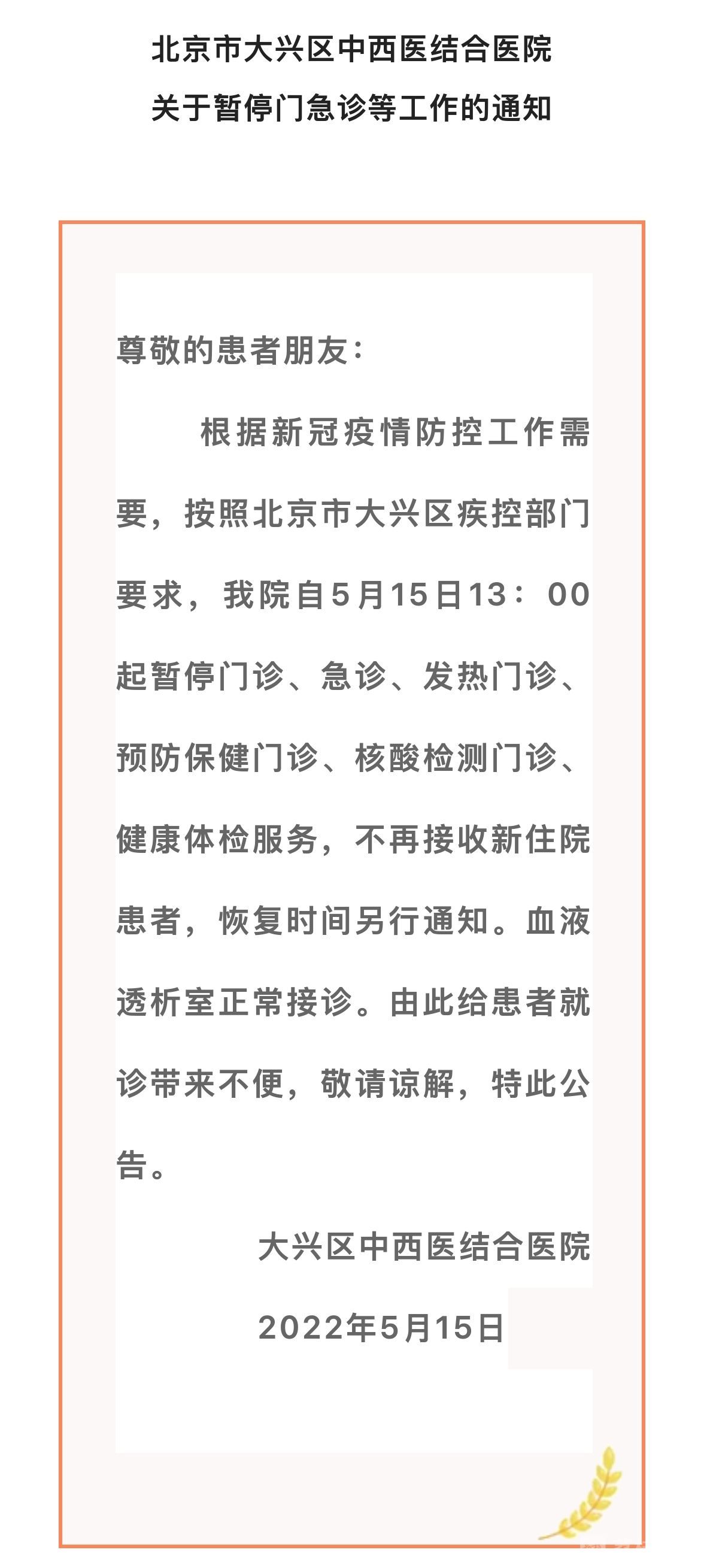 荔枝新闻讯 5月15日,“北京市大兴区中西医结合医院”官方微信发布通知称:根据新冠疫情防控工作需要,按照北京市大兴区疾控部门要求,我院自5月15日13:00起暂停门诊、急诊、发热门诊、预防保健门诊、核酸检测门诊、健康体检服务,不再接收新住院患者,恢复时间另行通知。血液透析室正常接诊。由此给患者就诊带来不便,敬请谅解,特此公告。