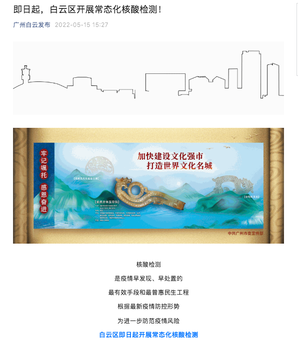 荔枝新闻讯 据“广州白云发布”微信公众号15日消息,核酸检测是疫情早发现、早处置的最有效手段和最普惠民生工程,根据最新疫情防控形势,为进一步防范疫情风险,白云区即日起开展常态化核酸检测。