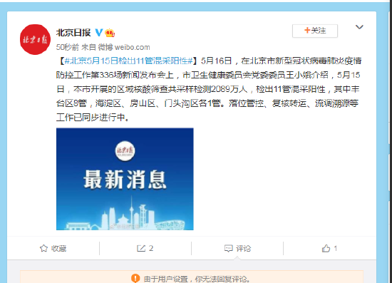 5月16日,在北京市新型冠状病毒肺炎疫情防控工作第336场新闻发布会上,市卫生健康委员会党委委员王小娥介绍,5月15日,本市开展的区域核酸筛查共采样检测2089万人,检出11管混采阳性,其中丰台区8管,海淀区、房山区、门头沟区各1管。落位管控、复核转运、流调溯源等工作已同步进行中。